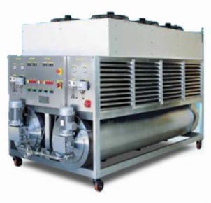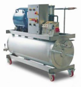 Corpo trocador cheio de raspado cilindro, evaporador de expansão direta com isolamento de poliuretano expandido e chapa de aço revestido, lâminas de raspagem em PTFE, hermética semi- compressor e condensador de ar, sobre rodas , painel elétrico com controle automático de temperatura do produto de saída , interruptores de pressão e medidores.