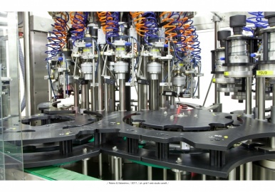las cápsulas de vino espumoso se extraen mecánicamente del cargador antes de entrar en la campana.